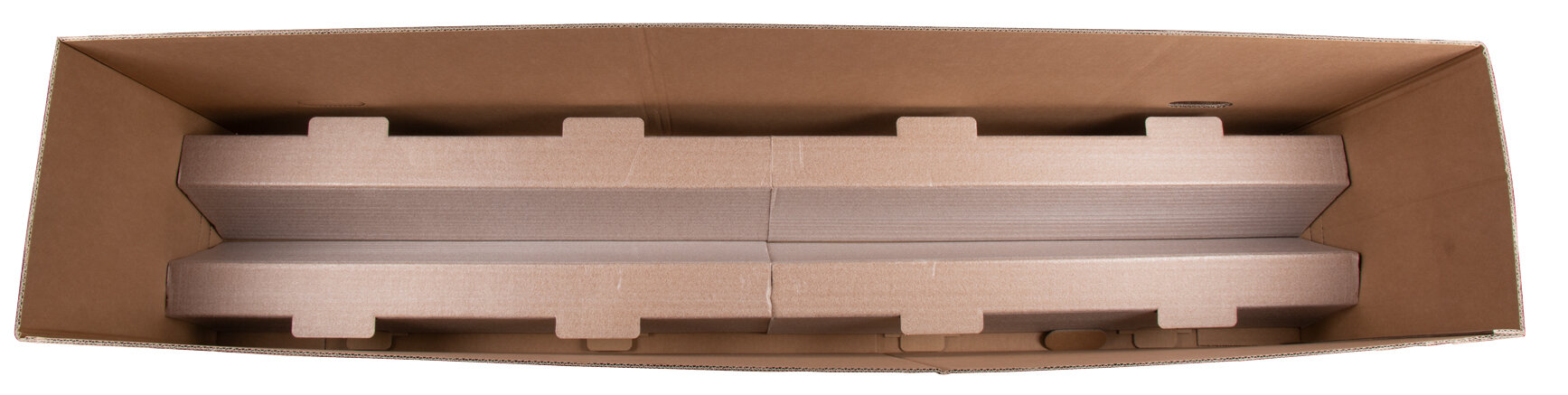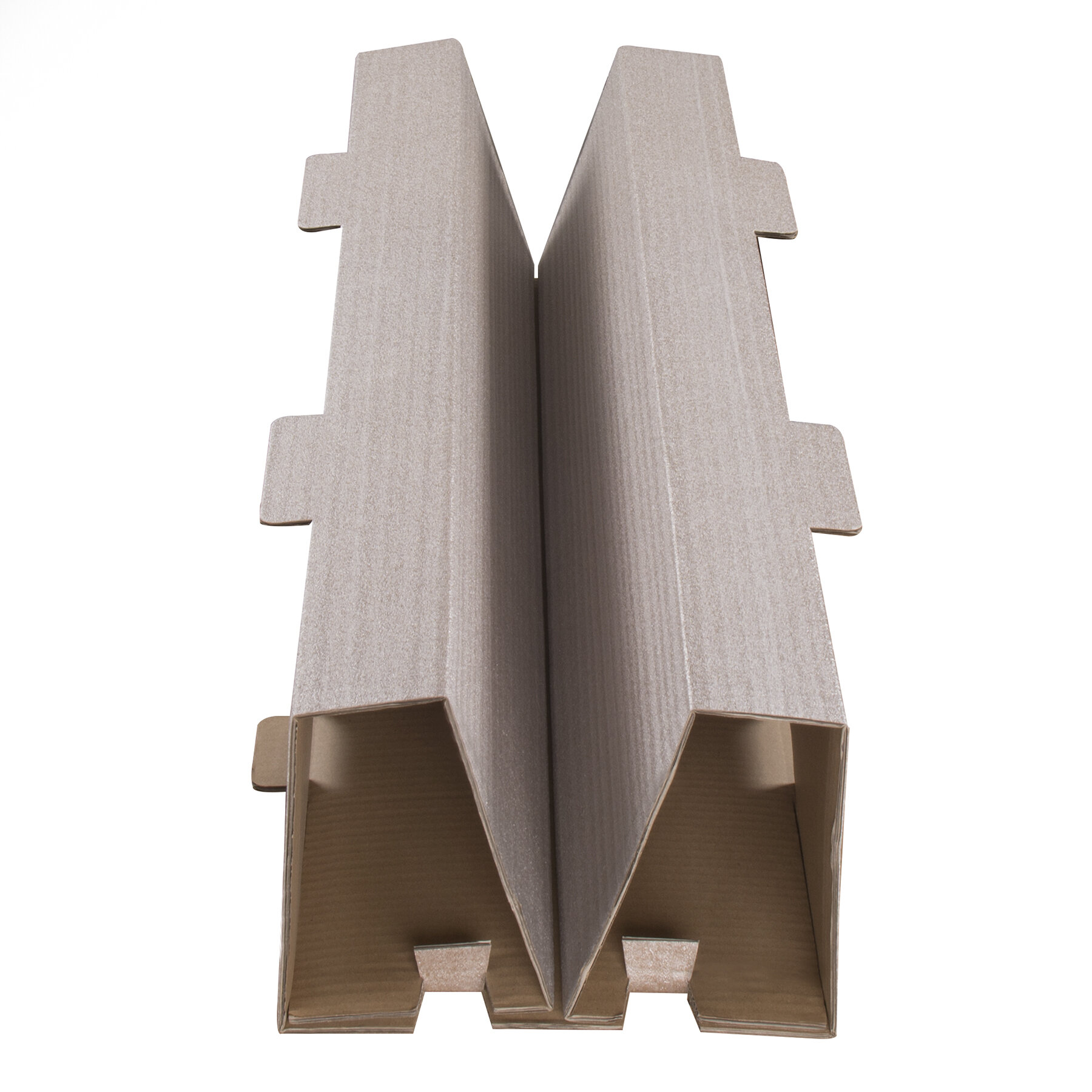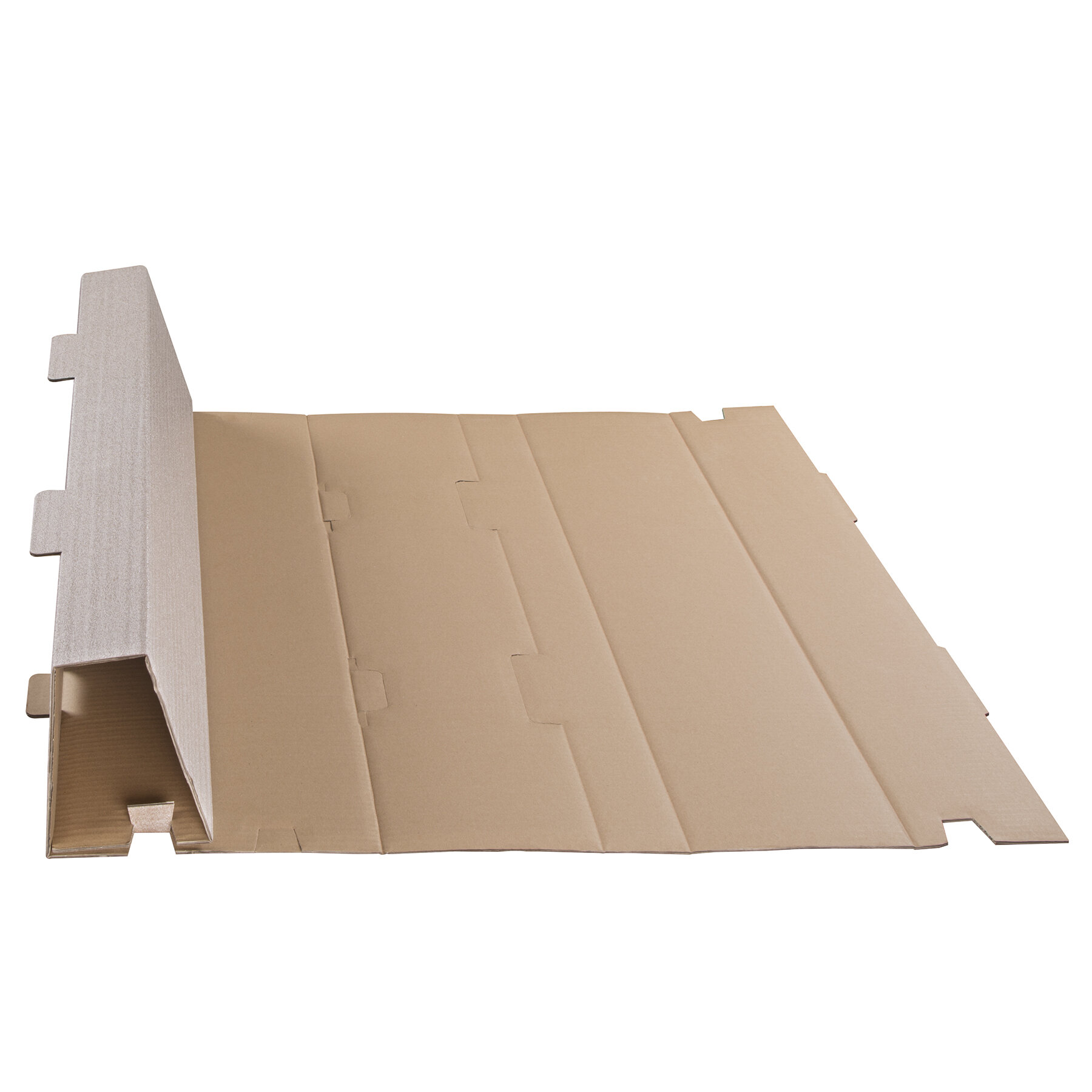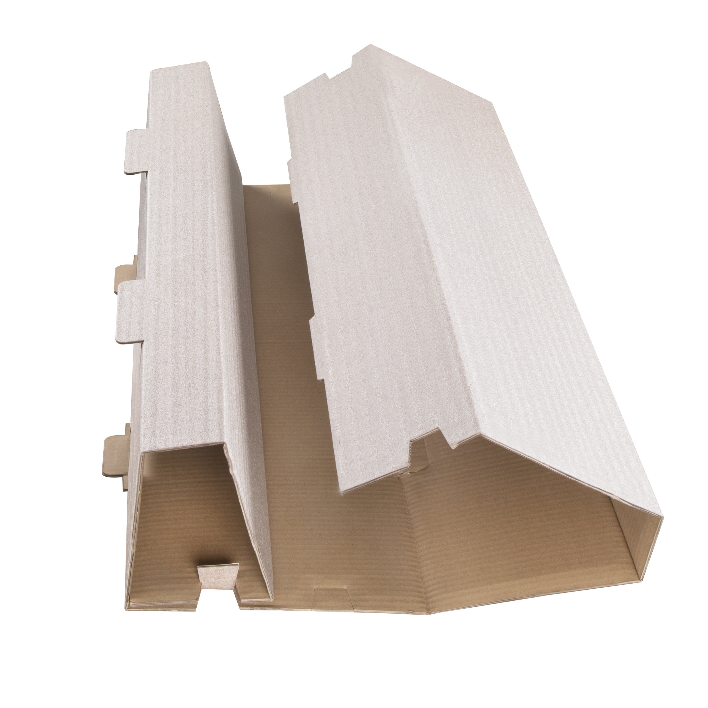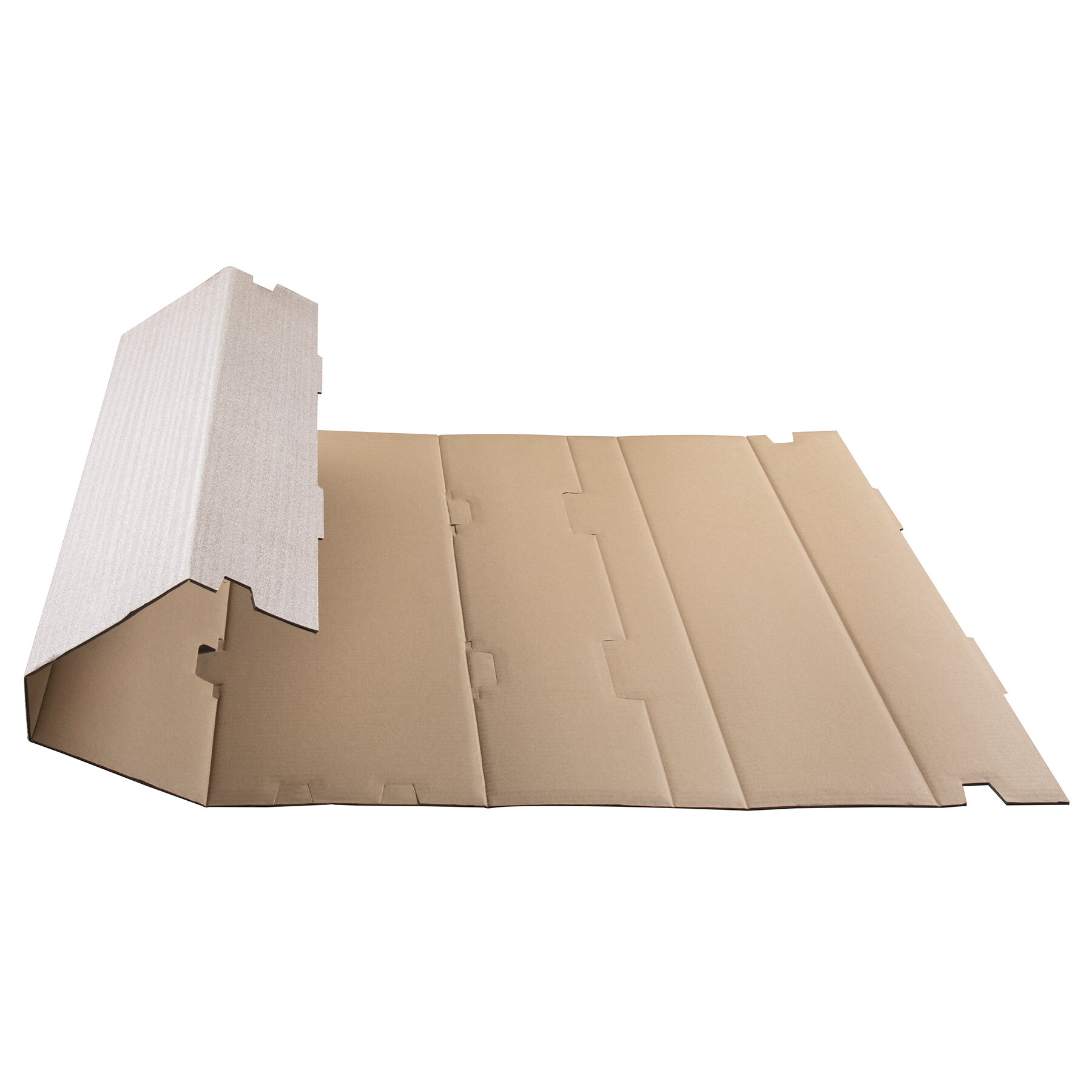 Die kaschierten Innenpolster sind nun aufgebaut. Zwei Innenpolster legen Sie mit dem Spalt nach oben in den Karton. Anschließend stellen Sie den zu transportierenden Fernseher hinein, sodass er durch den Spalt fixiert wird.