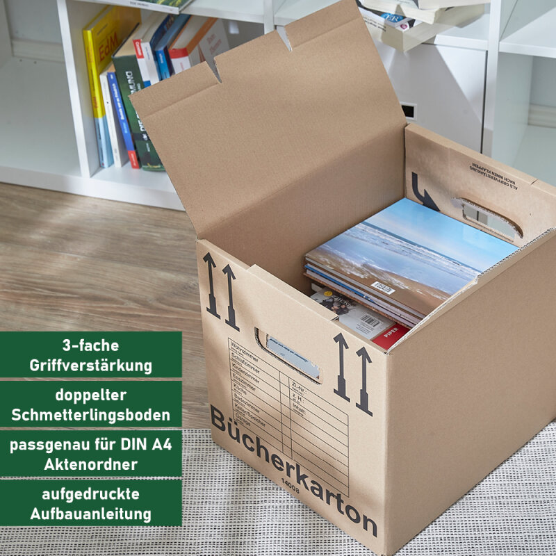Die wichtigste Eigenschaft des Bücherkartons ist etwas ungewöhnlich, denn es ist seine geringe Größe. Weil der Karton außerdem ein geringes Eigengewicht und denselben doppelten Schmetterlingsboden hat, den wir auch bei unseren größeren Kartons verwenden, finden so auch schwerere Objekte sicher zum Ziel. Denn der Bücherkarton ist handlich und stabil, wozu auch die 3-fache Griffverstärkung beiträgt. Und ganz wichtig: Er wird nicht so schnell überladen, was Ihnen nicht nur Ihr Rücken danken wird, sondern auch Ihre Helfer.