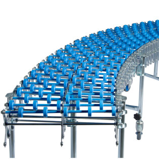 Durch einzeln gelagerte und leichtlaufende Röllchen bietet die Scheren-Röllchenbahn eine hohe Spurtreue für den Lauf des Fördergutes. Die Scherenbahn ist flexibel in der Streckenführung, so dass eine Kurve oder S-Kurve gebildet werden kann.