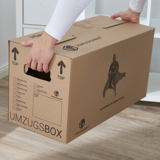 Wenn es um Umzüge geht, ist das neue Modell ein Superheld! Und genau das ist auch der Slogan, der auf den Kartonagen steht: „Superheld für deinen Umzug“. Das neue Design nimmt nämlich keinen Einfluss auf die bisherigen Vorteile des Umzugskartons. Er wird sogar noch besser! Ein doppelter Schmetterlingsboden erhöht die Stabilität der Unterseite. Für angenehmen Tragekomfort sorgt die dreifache Griffverstärkung. Mit der aufgedruckten Anleitung steht der Umzugshelfer im Handumdrehen und das große Beschriftungsfeld erleichtert das Organisieren und zum späteren Zeitpunkt auch das Auspacken.