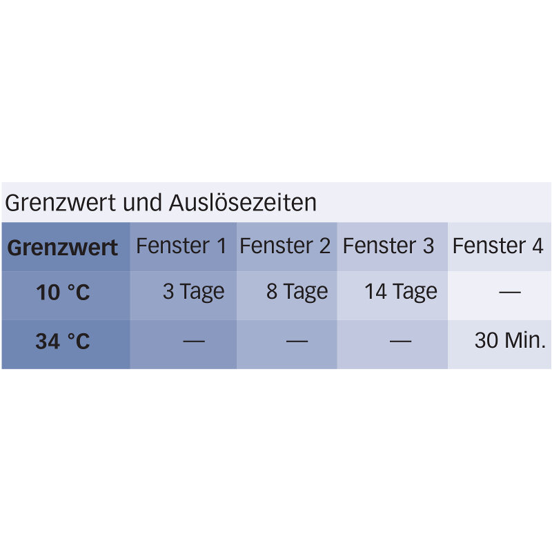 - Zeitraumüberwachung bei Temperatur höher als 10 °C sowie Temperaturspitzen über 34 °C