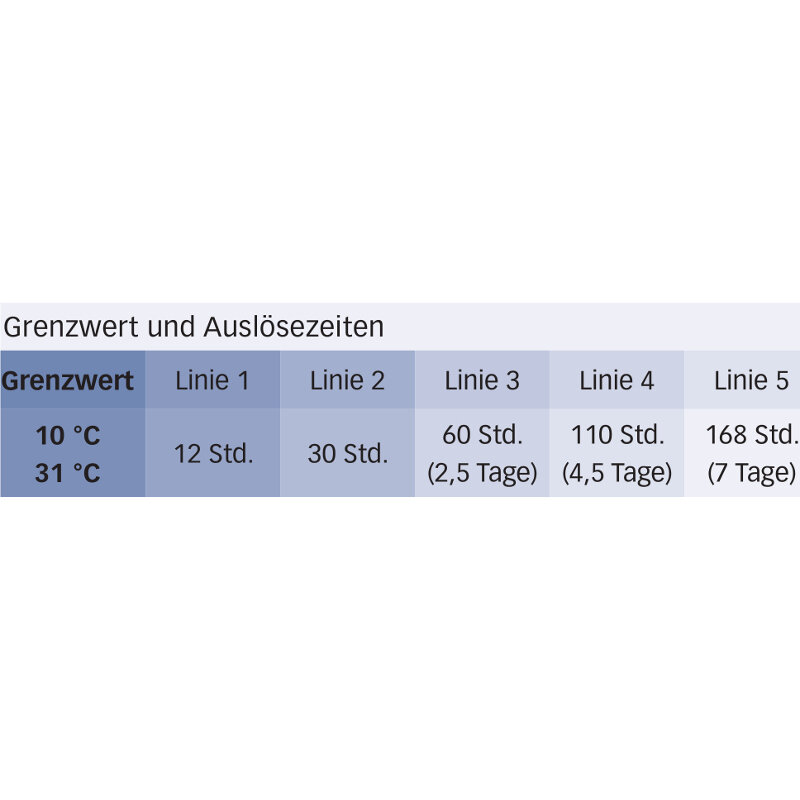 - Dauer der Temperaturüberschreitung ablesbar (anhand 5 Indikatorlinien)